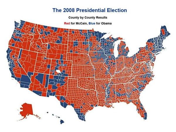 红代表共和党赢了,蓝代表民主党赢了,划分是县级的。